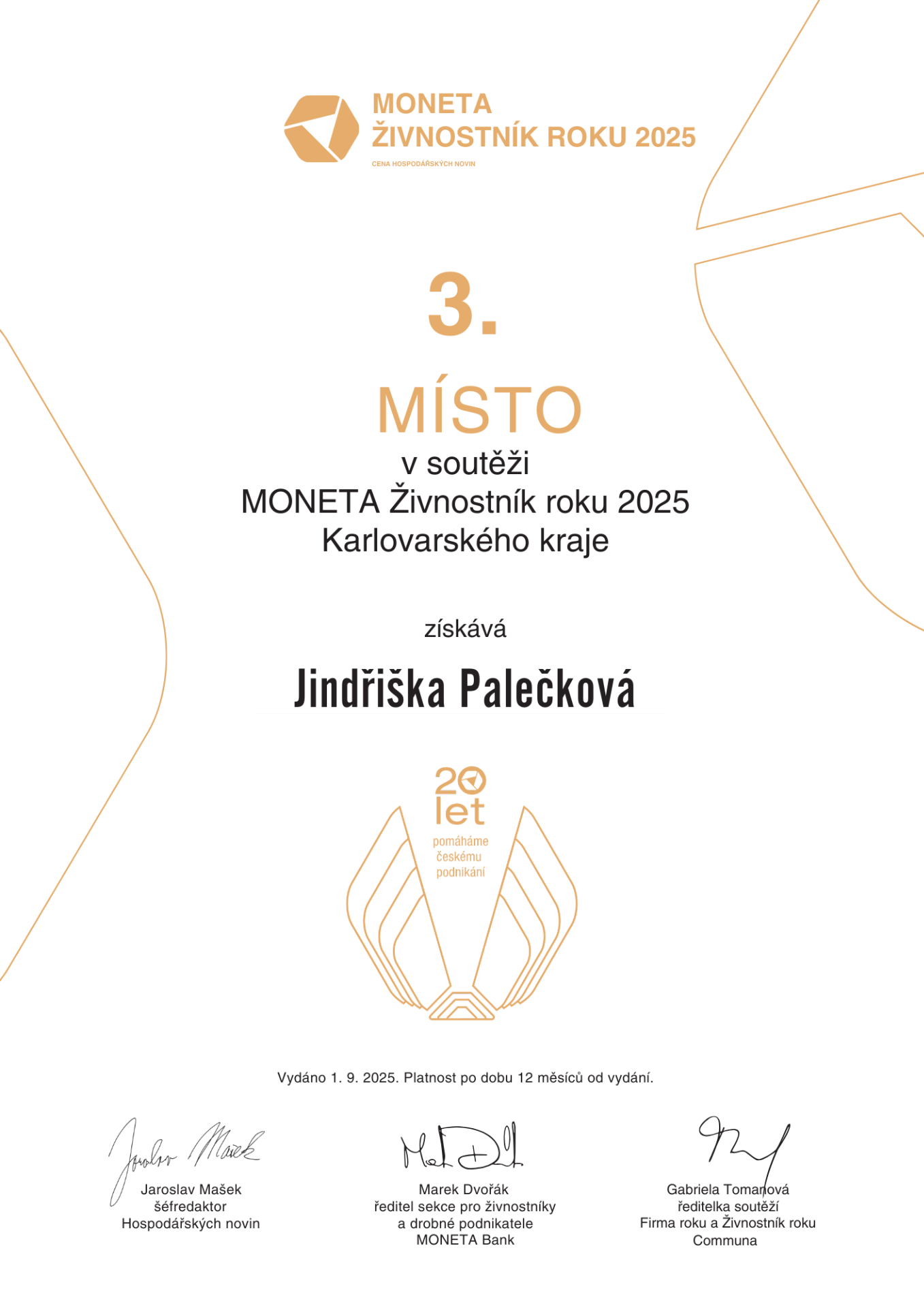 V soutěži MONETA Živnostník roku 2025 jsem získala 3. místo v Karlovarském kraji.